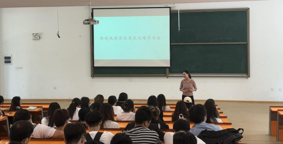 然后,苗贞贞老师介绍了跨境电子商务专业基本情况,包括什么是跨境电商以及跨境电商企业、跨境电商的就业岗位需求以及公司针对跨境电商专业员工制定的培养目标和课程设置。苗贞贞老师重点讲解了跨境电商专业的岗位需求,包括产品开发、跨境电商运营、运营推广专员、美工/设计师/剪辑师、外贸业务员以及品牌主播。同时,苗贞贞老师也指出电子商务专业和跨境电商专业在一些课程设置上有重叠,一些工作内容也都是相似的,但工作内容中由于跨境电商专业主要针对的是国外市场,部分工作内容规则与电子商务专业不同。