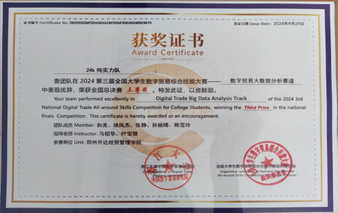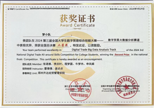 2024年9月29日,第三届全国老员工数字贸易综合技能大赛全国总决赛在杭州落下帷幕,本次大赛由浙江大学中国数字贸易研究院主办,旨在通过“以赛促教,以赛促学,以赛促改,以赛促建”的模式,推动高校数字化人才的培养与发展。公司积极响应,组织多支队伍参赛,经历校赛、区域赛、全国总决赛三阶段的比拼,最终两支队伍在全国总决赛数字贸易大数据分析赛道中荣获二等奖和三等奖的亮眼成绩。