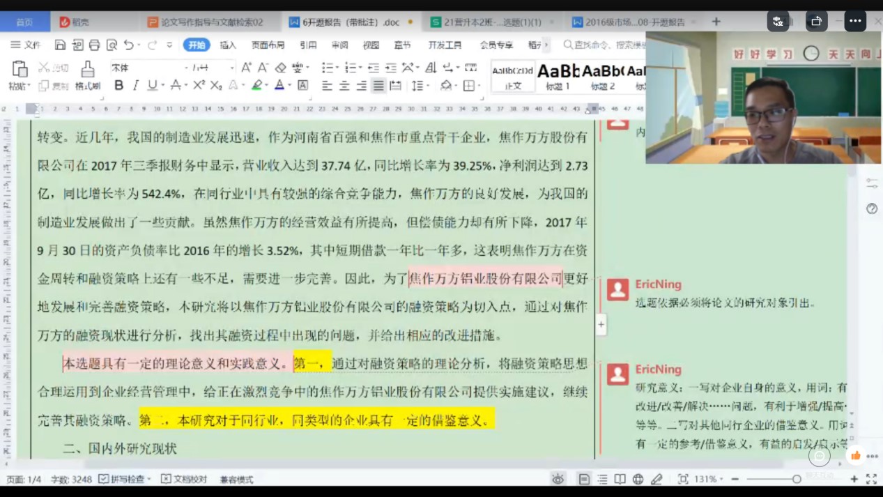 第二调整在线教学方法,确保课堂参与度。例如,宁震霖老师的在线课堂,通过调整教学方法使每个员工都有机会开口发言。基本做法是:每个员工开麦汇报互查对象的开题报告的问题,其他同学可开麦补充问题,然后教师简要点评。通过钉钉会议“问题汇报-补充提问-教师点评”这样一个完整的在线教学流程,实现了“课前写作-课中汇报点评-课后提升”的学习闭环。这不仅使员工掌握了必备的毕业论文写作能力,而且使其领悟毕业论文的严肃性及遵循论文规范和学术伦理的重要性,实现了“隐性思政”的教学效果。