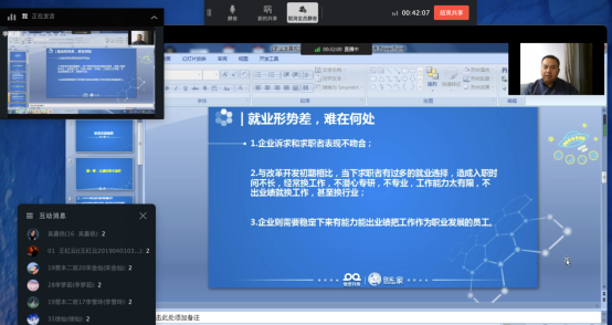 郑州创实房地产营销策划有限公司总经理、升达员工会会长周延翟为同学们做了一场主题为“职业发展规划:毛竹精神&管道思维”的讲座,周总具有丰富的工作经验,此次讲座从2022年就业形势的现状引入,让同学认清目前就业难在何处,面对看起来就业形势难的情境下,透过现象看本质,在职业中能够坚守,对同学们就业和创业提出了新思路,对同学们在今后的工作学习提出了期盼和要求,要树立正确的就业观、人生观、价值观。