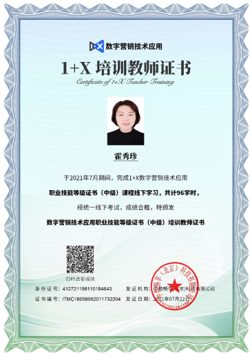 2021年7月11日-2021年7月16日,“1+X数字营销技术应用职业技能等级证书(中级)团队培训班”在南京举办。为进一步贯彻教育部等四部门印发《关于在院校实施“学历证书+若干职业技能等级证书”制度试点方案》的通知(教职成〔2019〕6号)、《关于推进1+X证书制度试点工作的指导意见》(教职成厅函〔2019〕19号)精神,提升公司开展试点工作的整体水平,yl7703永利集团官网派市场营销专业教研室主任霍秀珍老师参加此次培训。