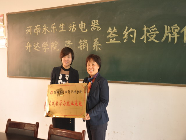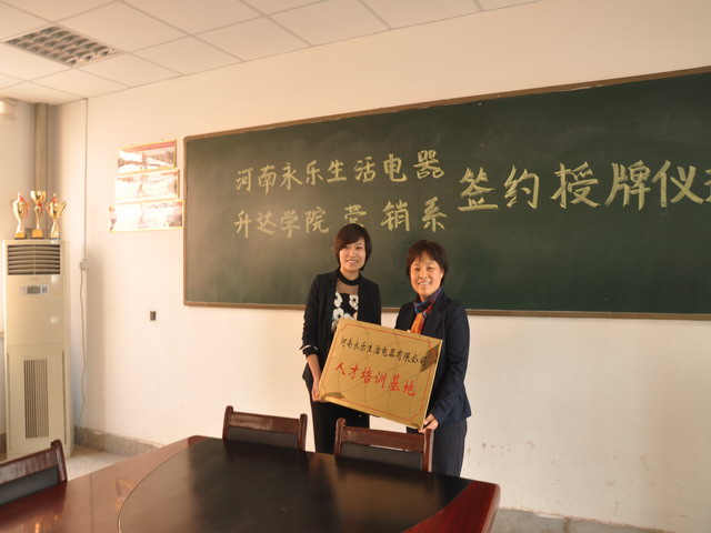 10月23日上午10时,永乐集团招聘人资部经理张燊、招聘主管朱瑜红一行莅临我系交流合作,并就河南永乐生活电器与升达公司市场营销系校企合作进行签约授牌。