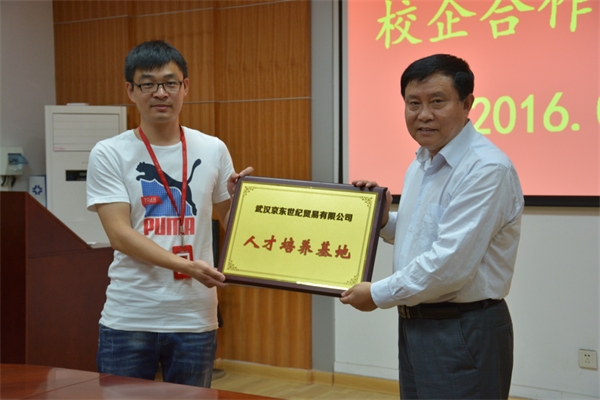 签约仪式由京东仓储部经理白红宾先生与公司教务处处长吴益民先生执笔隆重签约,并由武汉京东世纪贸易公司向公司颁发“人才培养基地”牌匾。