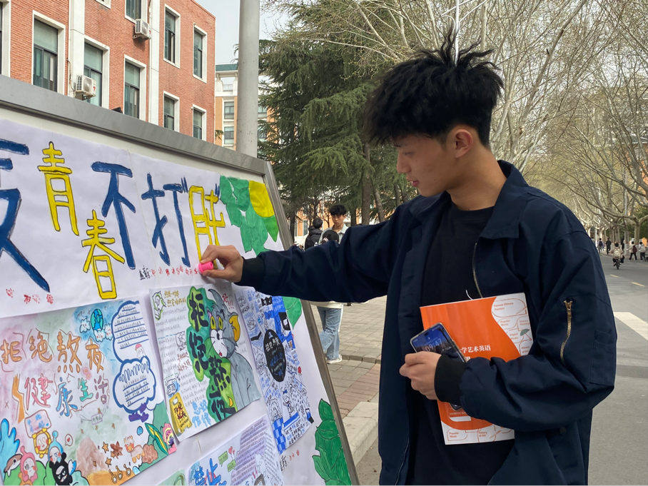 3月24日,入围作品在教学2号楼门口集中展示。路过的同学们纷纷停下脚步,为自己心仪的作品投上一票。投票现场气氛热烈,大家在欣赏作品的同时,也对健康作息有了更深刻的认识。