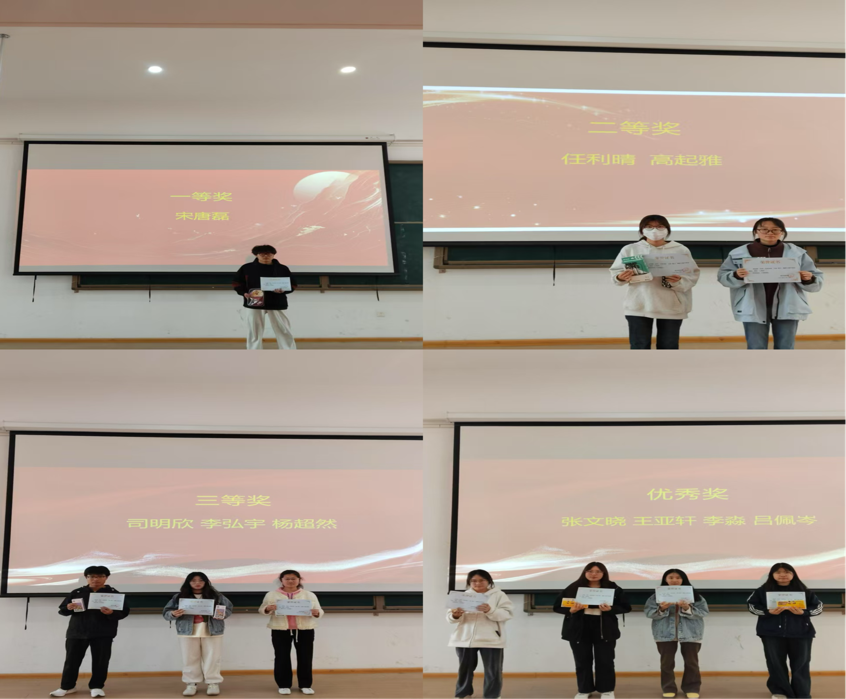 参赛作品收集结束后,由各部门对作品进行认真评选。共评选出一等奖1名、二等奖2名、三等奖3名以及优秀奖若干。4月1日在教2楼116教室进行颁奖。获奖的作品通过展板的形式进行集中展示。
