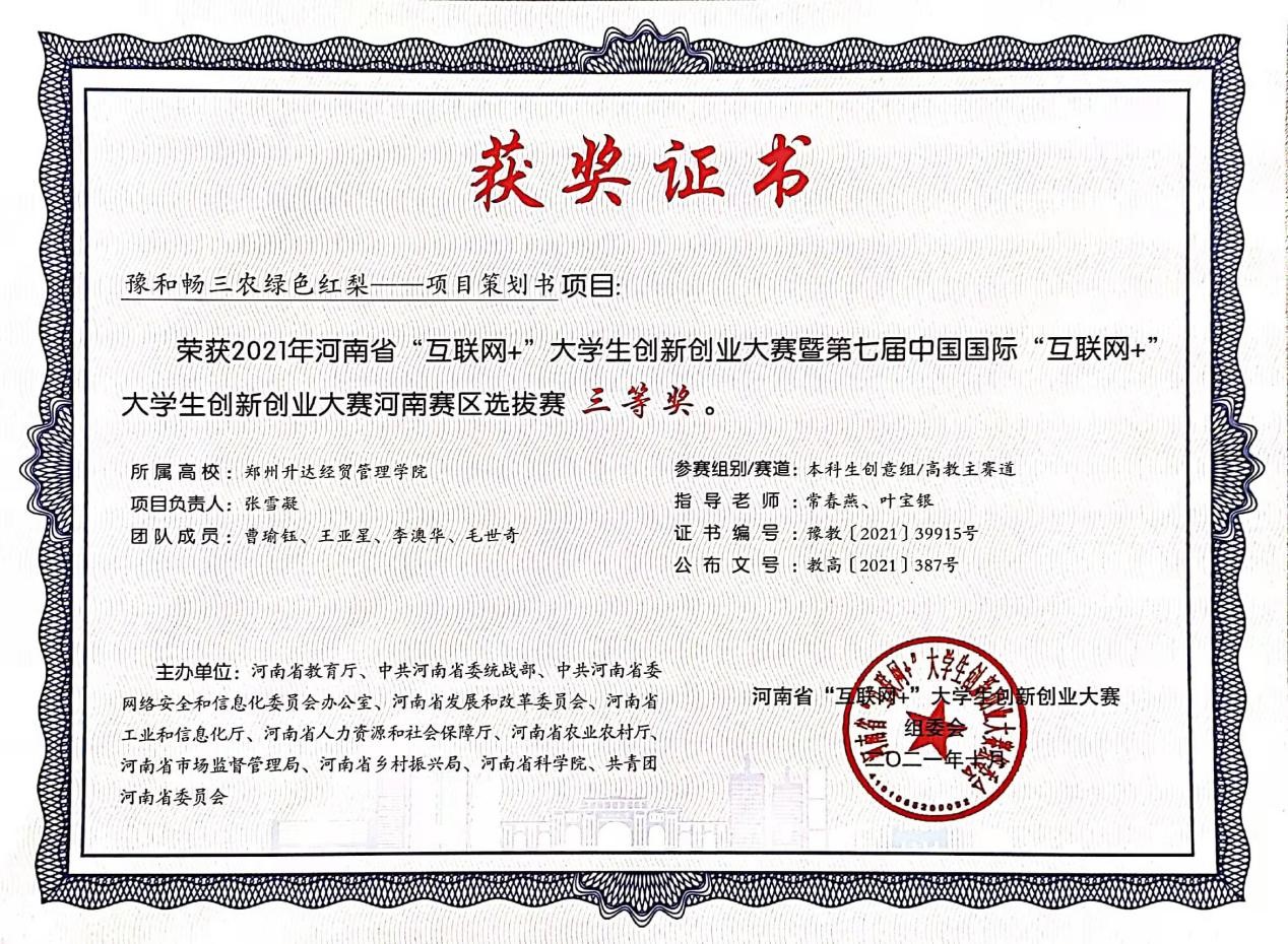 第七届中国国际“互联网+”老员工创新创业大赛以“我敢闯、我会创”为主题,围绕“更中国、更国际、更教育、更全面、更创新”的办赛目标,以赛促教、以赛促学、以赛促新,旨在培养创新创业主力军,探索人才培养新途径,为国家及地方社会发展培育优质创业复合型人才。2021年7月21日至22日,“建行杯”2021年河南省“互联网+”老员工创新创业大赛暨第七届中国“互联网+”老员工创新创业大赛选拔赛在河南师范大学举行。经过前期省内各高校的层层选拔,yl7703永利集团官网电子商务专业员工团队报送的“豫和畅“三农”绿色红梨”获得省赛三等奖。
