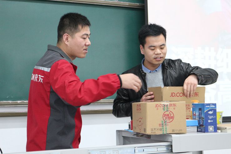 大会伊始,首先由京东企业人资部马锐经理分别对京东的集团文化,发现概况,人资待遇,规章制度等方面做了详细的介绍。其次郑州分拨中心质控负责人李卓为我们讲解京东的生产线、仓储流程。最后由郑州仓储部生产经理黄承磊为讲解京东快递包装的流程,并且现场演示,邀请同学们上台现学现用。