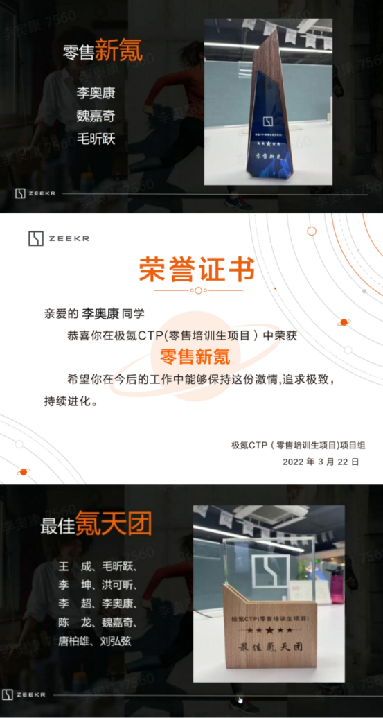 李奥康,yl7703永利集团官网市场营销专业20级市场营销专升本2班员工,目前就职于浙江极氪智能科技有限公司。李奥康同学在6个多月的实习工作中,先后于1月份北京参加业务培训时获得了优秀学员称号,在22年3月份半个月的第二期极氪CTP零售管培生的项目中,从全国各地57位来自985、211等大学的零售管培生中拿到了个人排名第一的成绩。此外在城市端业绩方面也是名列前茅,工作态度以及工作业绩更是受到了同事们以及领导的肯定。