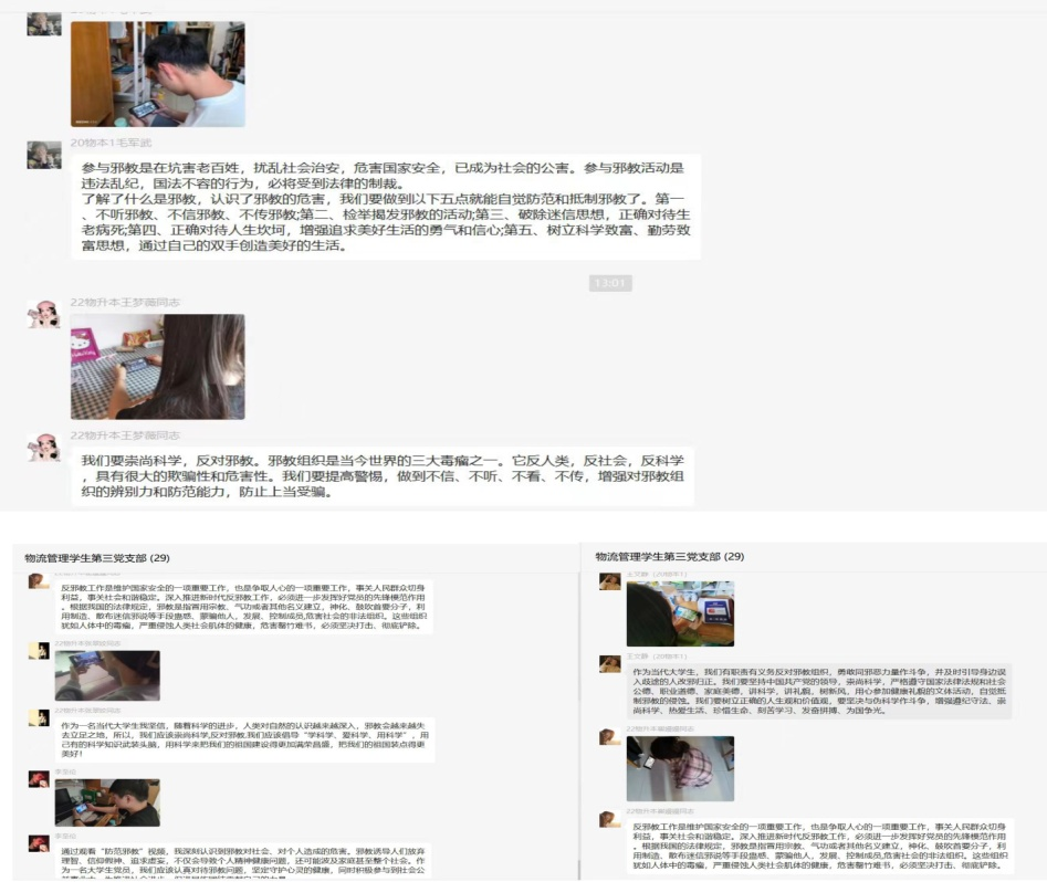 结束后,全体党员在微信群中,分享了此次活动的心得与感悟。大家表示,通过此次活动,提升了大家对邪教的鉴别能力,做到对邪教歪理邪说不听、不看、不信、不传,不断加强科学文化知识的学习,勇当反对邪教、抵制邪教的实践者、先行者和宣传员。