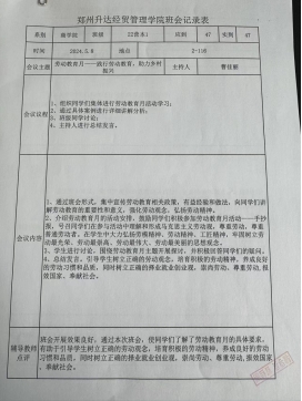 会后,各位辅导员在班级召开劳动教育月主题班会,并签署班会记录表,辅导员老师带领各位同学深入学习习近平总书记关于劳动教育重要论述的核心要义,“新时代的伟大成就是党和人民一道拼出来、干出来、奋斗出来的”,“要在全社会弘扬劳动精神、奋斗精神,培育时代新风新貌”。通过主题班会的形式将这些理论知识融入到同学们日常的学习和生活中。