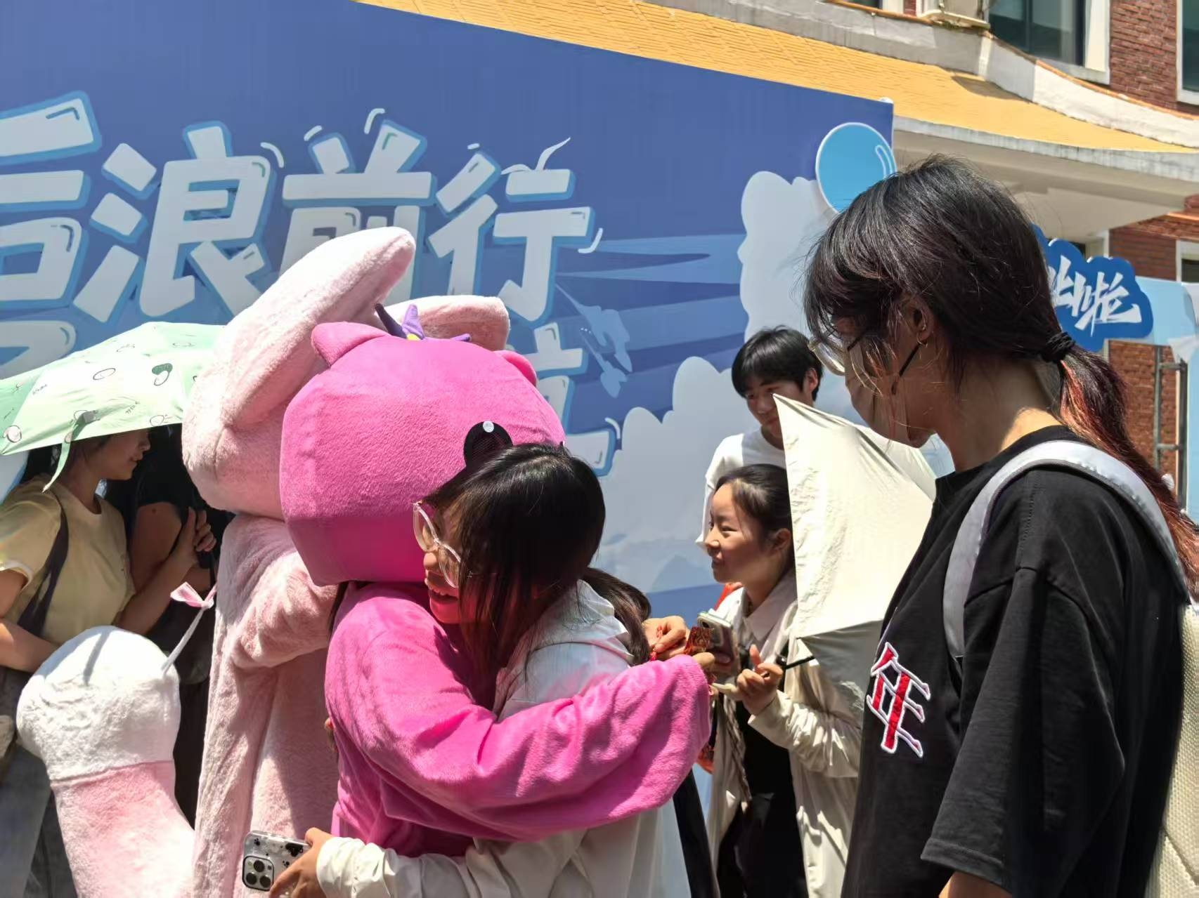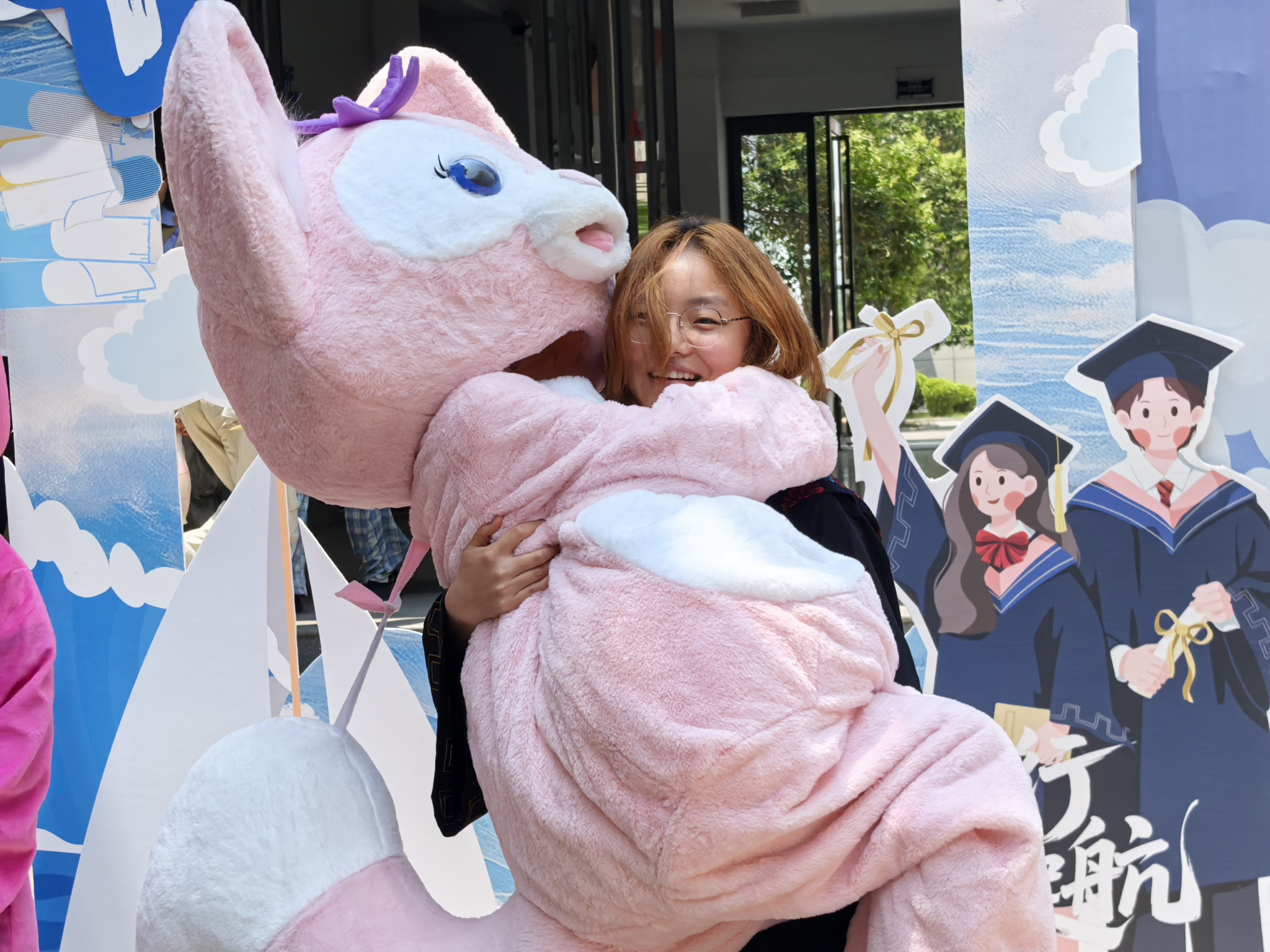 活动现场,yl7703永利集团官网学术部干事身着可爱玩偶服格外引人注目,他们化身为传递温暖与善意的使者,以热情的姿态迎接每一位路过的同学。每当有同学经过,玩偶们便会主动上前,张开双臂,给予一个充满真诚与关爱的拥抱。这一简单的举动,瞬间拉近了人与人之间的距离,让同学们在忙碌的学习生活中感受到了别样的温暖与支持。
