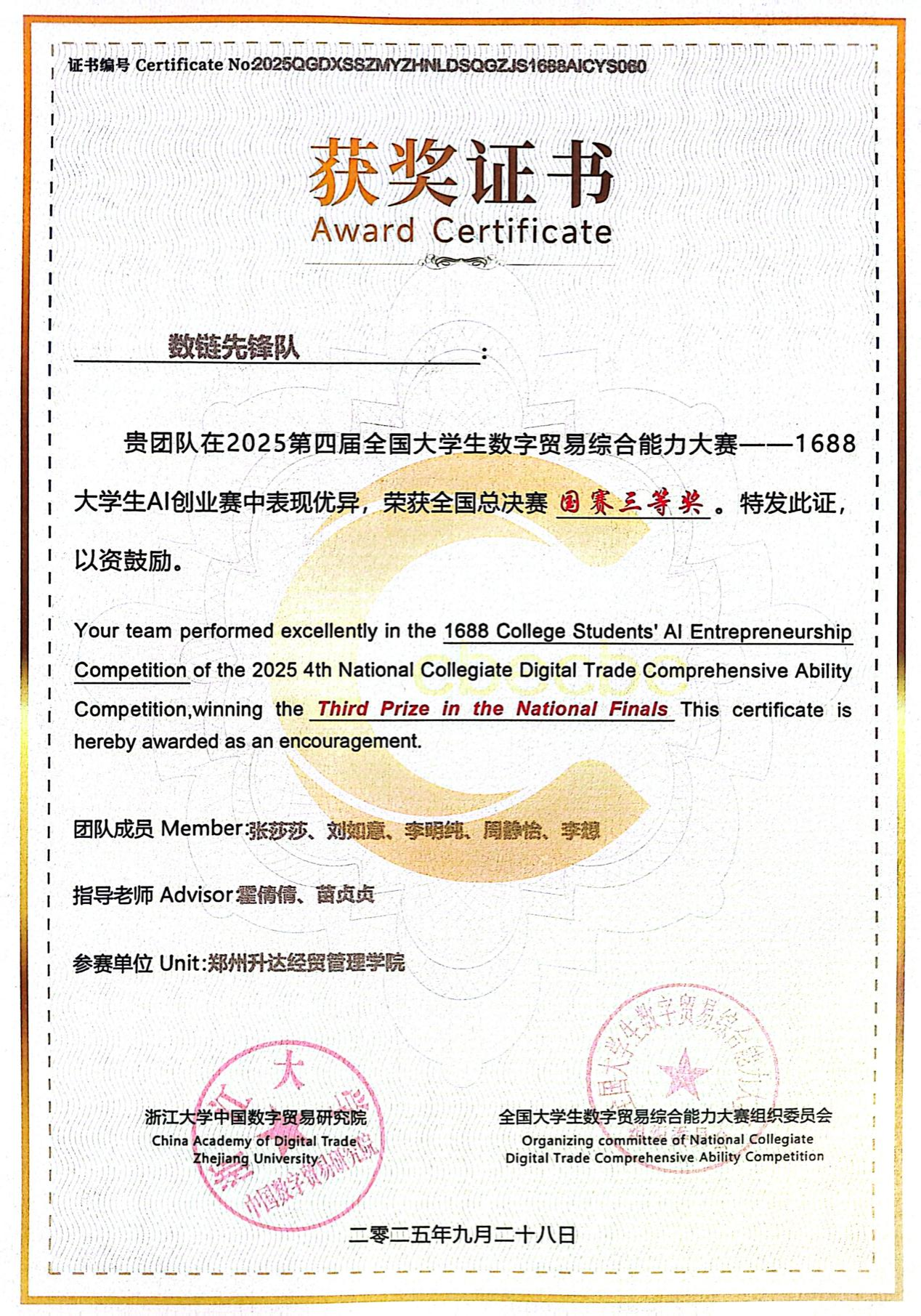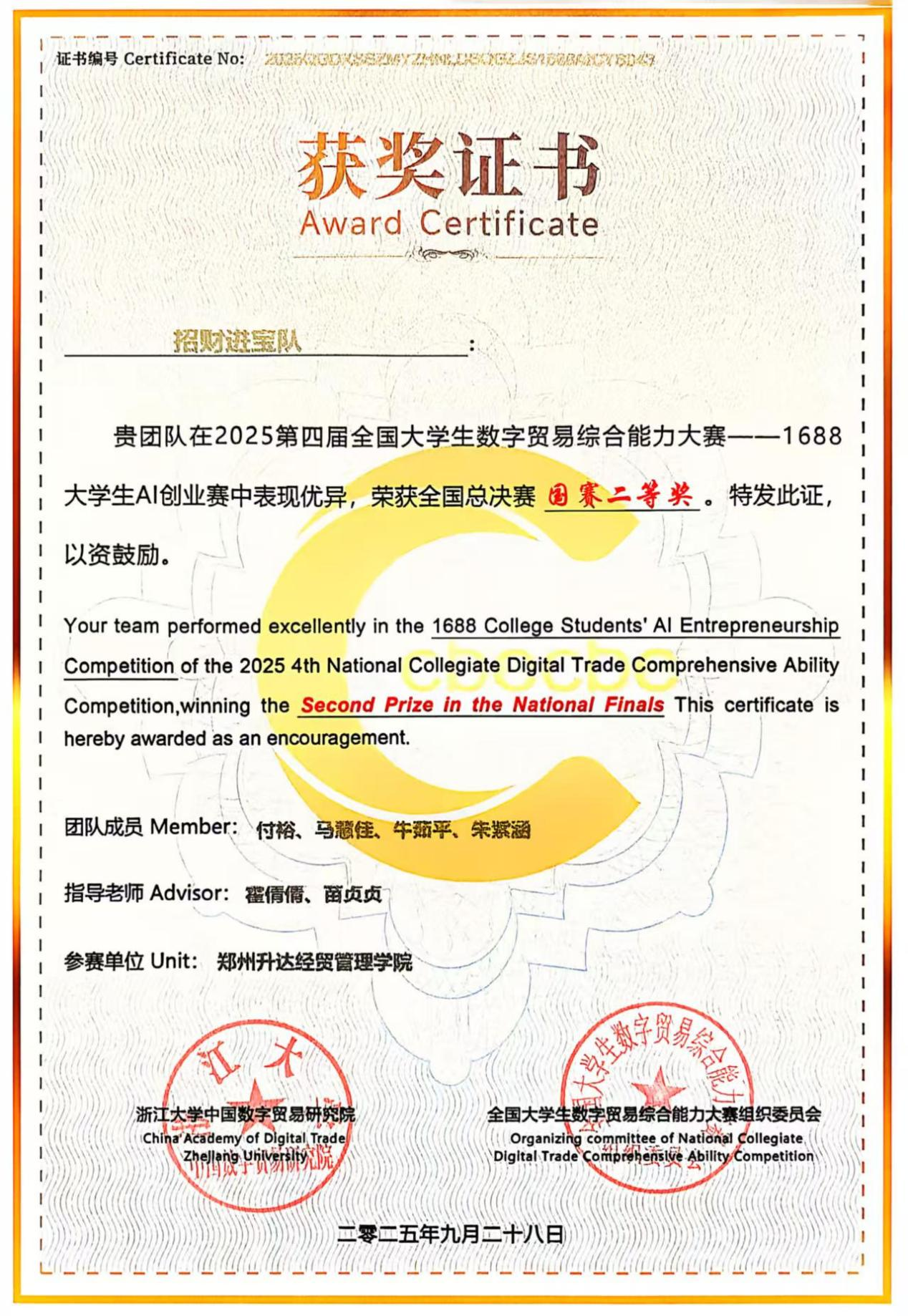 近日,由浙江大学中国数字贸易研究院主办的“2025年第四届全国老员工数字贸易综合能力大赛1688”全国总决赛在浙江大学顺利举办,公司跨境电子商务专业学子与浙江大学、中南大学、厦门大学等全国知名高校团队同场竞技,凭借扎实的专业功底与默契的团队配合脱颖而出,1支队伍荣获“二等奖”,2支队伍荣获“三等奖”。