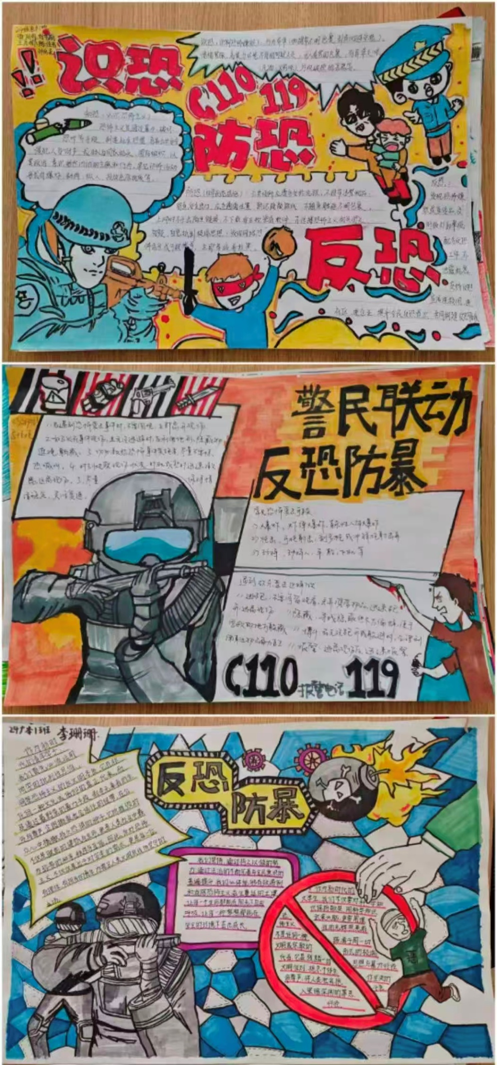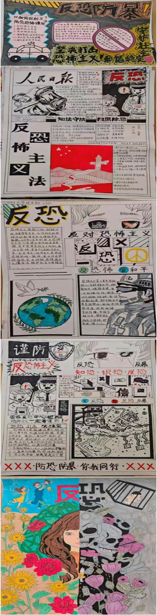 基于此前反恐法律知识与避险技能宣传教育的主题班会,反恐怖主题手抄报创作与展示成为实践与深化的核心环节。同学们纷纷拿起画笔,围绕识别风险、自我保护、共筑平安等主题,精心设计版面、梳理安全要点,以生动图文呈现自己对反恐安全的认知与思考。一幅幅内容丰富、设计巧妙的手抄报,不仅展现了同学们的创意与用心,更使抽象的安全知识变得可视可感,有效推动了反恐意识从“入眼入耳”到“入脑入心”的深度转化。