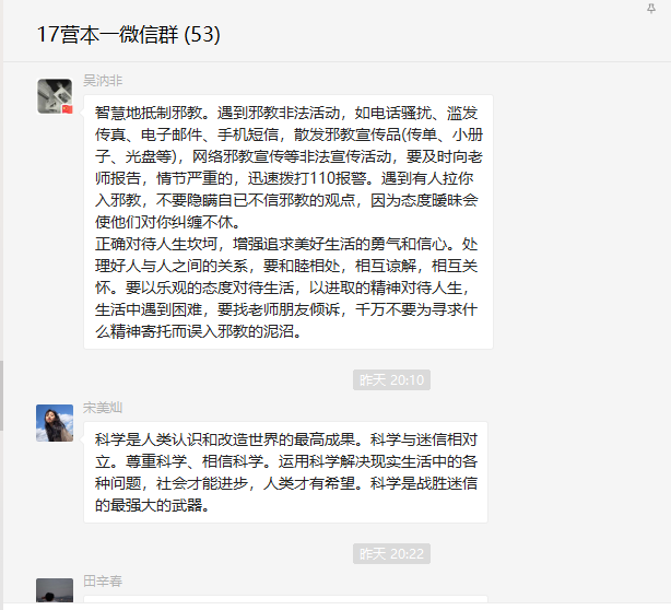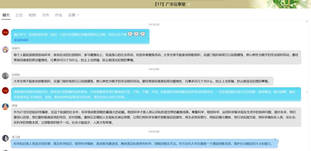 各班利用钉钉云课堂平台、QQ群、微信群集中学习反邪教相关知识,展开“识邪防邪反邪”反邪教知识问答活动。各个班级有序开展,同学们对于邪教是什么,我们应该怎样应对邪教,有了更深刻的认识。在活动之中,同学们互相学习,积极分享自己所知道的邪教相关知识。在最后的讨论过程中,同学们积极踊跃表达看法,表现出了较高的的主观能动性。