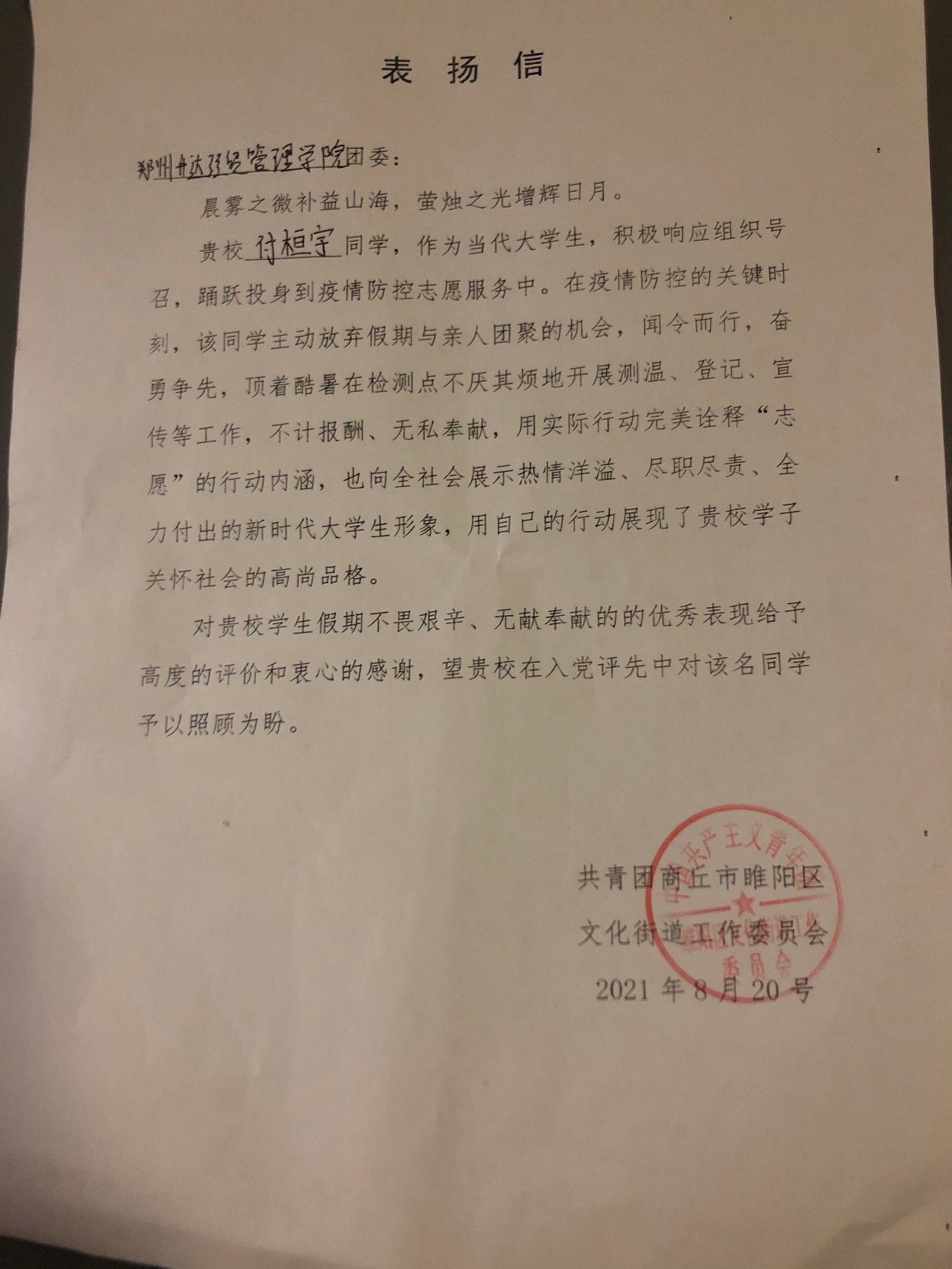 8月3日,2019级物流管理本科1班付桓宇同学怀揣着“苟利国家生死以,岂因祸福避趋之”的决心参加商丘市睢阳区文化街道团工委组建的志愿者服务活动,是所谓“党有号召,团有行动”。志愿活动期间,付桓宇同学立刻投入一线,落实登记、宣传等工作,并耐心解决当地群众的疑惑,安抚群众不安情绪。