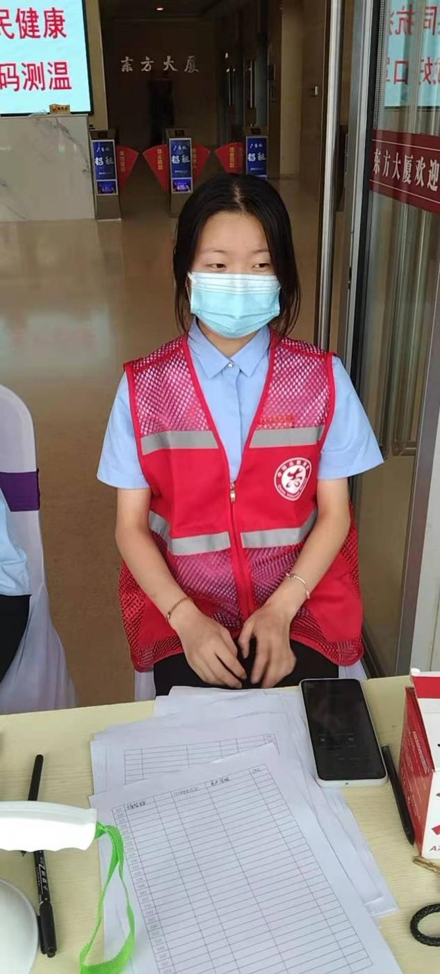 2020级物流管理专科1班李梦涵。在得知郑州疫情严重后,积极向政府和社区申请加入志愿者团队。积极参与郑州市二七区齐礼阎淮河路办事处的疫情防控工作。疫情防控期间,主要负责帮助疫情检测人员扫描健康码,并对他们测量体温,填写信息,核实信息正确性。并且增加对老年人帮助,提供力所能及的优质服务。同时,和其他志愿者们一同登记外来人员信息,排查疫苗接种情况,测量来往人员的体温。