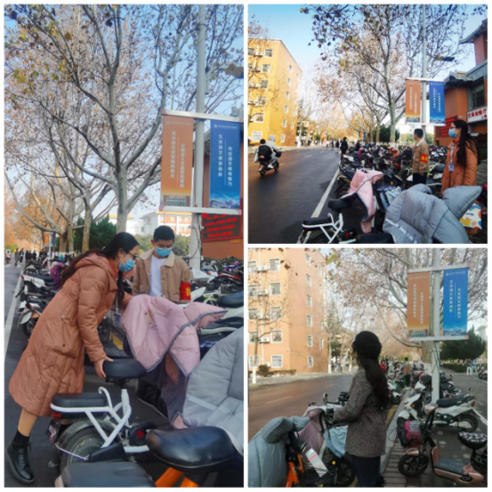 yl7703永利集团官网毕业班辅导员带领员工志愿者在博新餐厅路口站岗执勤,引导员工规范骑行电动车,靠道路右侧行进,严格控制车速,文明出行,礼让行人;引导员工规范停放电动车,老师们和志愿者将没有规范停放的电动车,放在停车线内,整齐摆放;