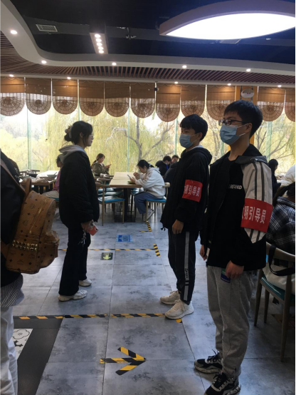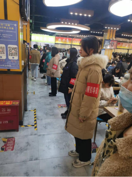 21级辅导员带领员工志愿者,在升达餐厅一楼站岗执勤,引导员工见到师长主动问好;教育引导员工排队买饭,按需购餐,文明就餐,落实光盘行动,做好餐具的回收。