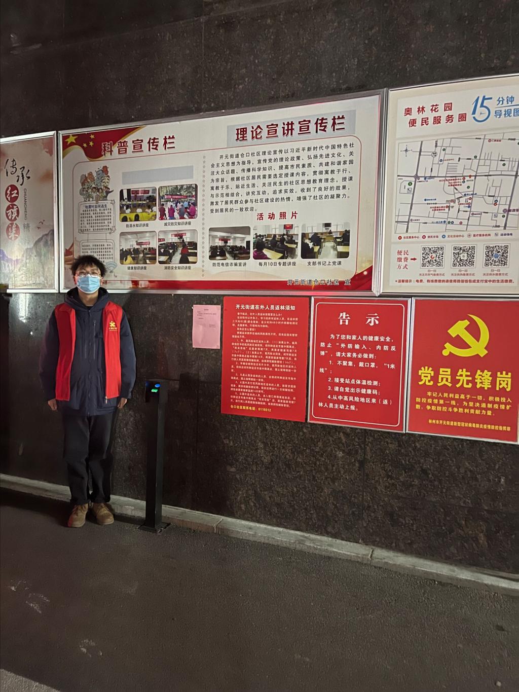 20电专2班(中外)的李坤阳每天最主要的任务就是组织社区进行核酸检测和社区卡点,当每次开始做核酸检测的时候,便换上防护服,拿起手机给每个参与核酸的社区居民进行扫码登记,每天最晚的时候甚至忙到凌晨四五点。但是这一切都是值得的,看着社区一天天好起来,禹州一天天好起来,再苦再累都是值得的。