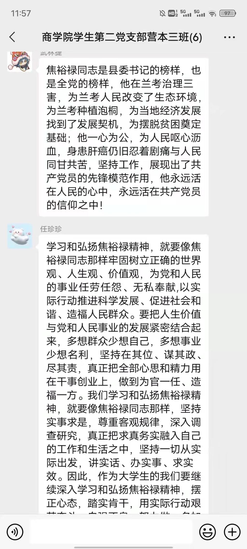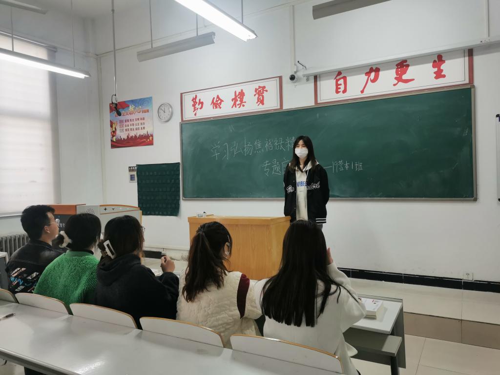 曹佳丽老师带领大家要重温焦裕禄的事迹,缅怀焦裕禄的功德,学习焦裕禄的品格,使大家对焦裕禄精神有了新的更加深刻的理解学习。在交流中,李治锋同学谈到:“作为时代新人,我们要积极学习焦裕禄同志勤俭节约、艰苦创业、实事求是、不怕困难的务实作风。 端正工作态度,真正把求真务实融入到自己的工作和生活之中。发扬自强不息、与时俱进、开拓创新的时代精神。保持不畏困难、坚忍不拔、奋发有为的精神状态,不断提升自己,努力成为实现中国梦的重要力量。”