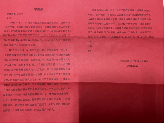 信中介绍:“2022年1月8日,滑县发现一名无症状感染者,当天下午接到滑县疫情防控指挥部指令,要求连夜开展第一轮全员核酸检测。郭晓静同学便不畏疫情、主动请缨,积极参加了镇政府组织的老员工志愿者团队冲击在一线。上官镇连续开展的10轮全员核酸检测,每一轮都要检测大约5.2万人次,每一轮检测都凝聚了老员工志愿者的爱心与热情。在工作过程中,她积极乐观,不畏苦累,获得了群众的高度赞誉,赢得了党委政府的高度认可。