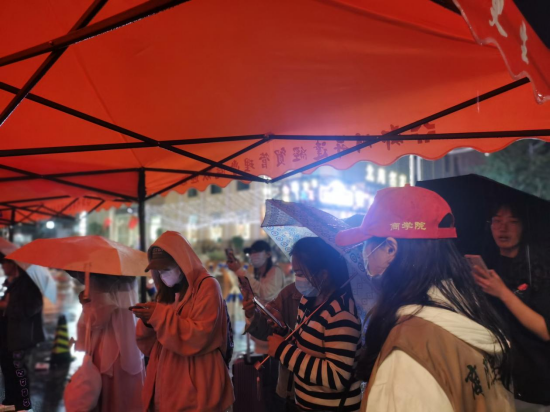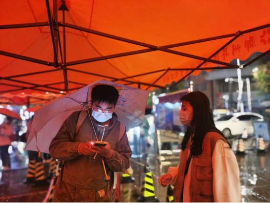 西大门处,志愿者们不惧当日风雨,毅然守卫在公司门口,认真细致检查同学们的行程卡、健康码、48小时内的核酸检测证明等,确保员工安全入校。由于进出校门人流量大,为防止发生拥堵,志愿者们有序引导同学保持间距,有序形成长长的队伍。从进门处扫码、验码、测温、科学佩戴口罩等,每一步都严格排查,严防无关人员入校,严防校外疫情输入。