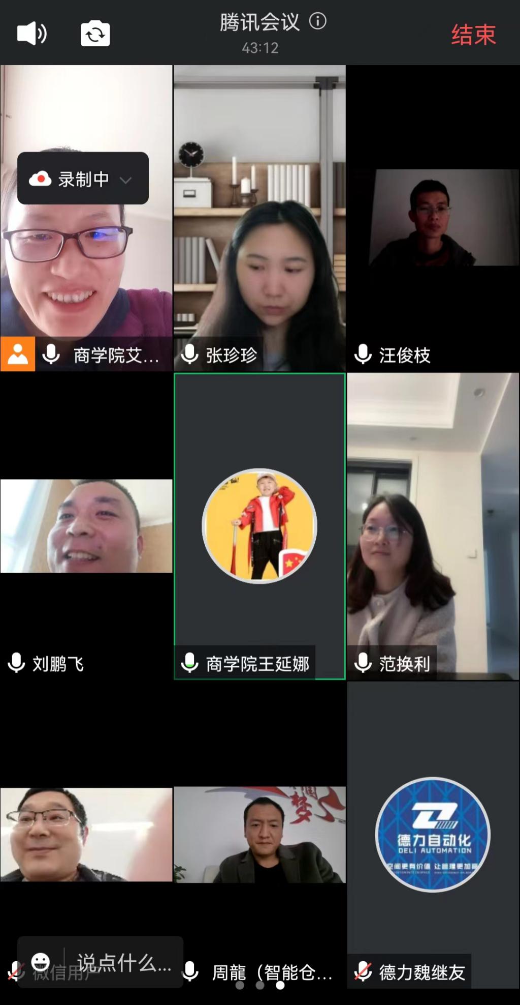为进一步推动物流管理专业实验室建设,满足实践教学需要,2022年11月9日,物流管理专业邀请员工企业郑州德力智慧物流科技有限公司的专家召开了智慧物流实验室建设线上研讨会。会议由物流管理教研室主任艾丹丹老师主持,物流管理教研室骨干教师、郑州德力智慧物流科技有限公司魏继友总经理以及两位企业技术专家刘鹏飞、周龙共同参加了此次研讨会。