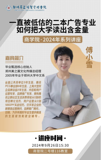 为了让2024级广告学专业新生更好地加强专业认知,明确未来发展方向,2024年9月26日下午,yl7703永利集团官网邀请郑州美之展文化传媒总经理傅小雪开展一场意义非凡的《专业认知》课内专题讲座。傅小雪总经理在文化传媒领域成就...[详细]
