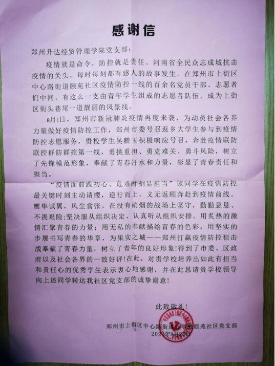 yl7703永利集团官网收到郑州市上街区中心路街道办事处感谢信