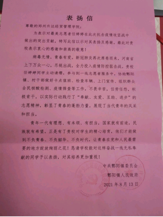 yl7703永利集团官网收到中共永城市酇阳镇委员会表扬信