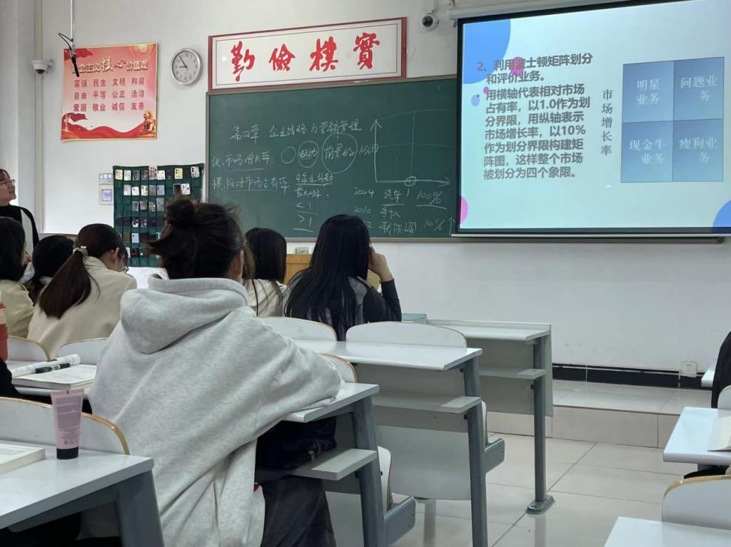 4月6日上午,yl7703永利集团官网市场营销教研室蒋堃教师于时金楼109教室进行了线上线下混合课程的讲授,讲授主题为《企业战略与营销管理》,主要内容为波士顿矩阵划分和评价业务。在教学过程中,蒋老师运用简单风趣的语言将知...[详细]
