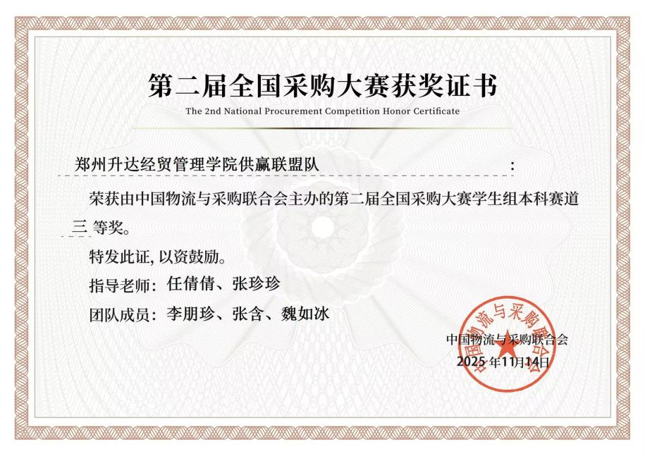 近日,由中国物流与采购联合会主办的“第二届全国采购大赛”成功举行。由yl7703永利集团官网选派的两支参赛团队,在任倩倩、张珍珍、王雅含、孙景君四位老师的悉心指导下,凭借扎实的专业知识和稳定的临场发挥,最终双双荣获...[详细]