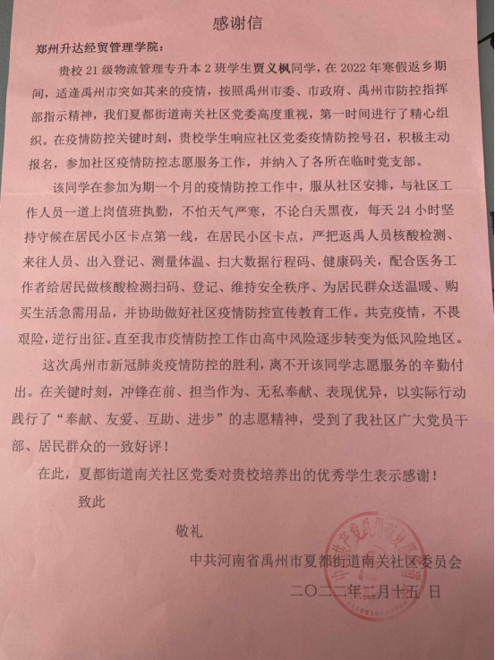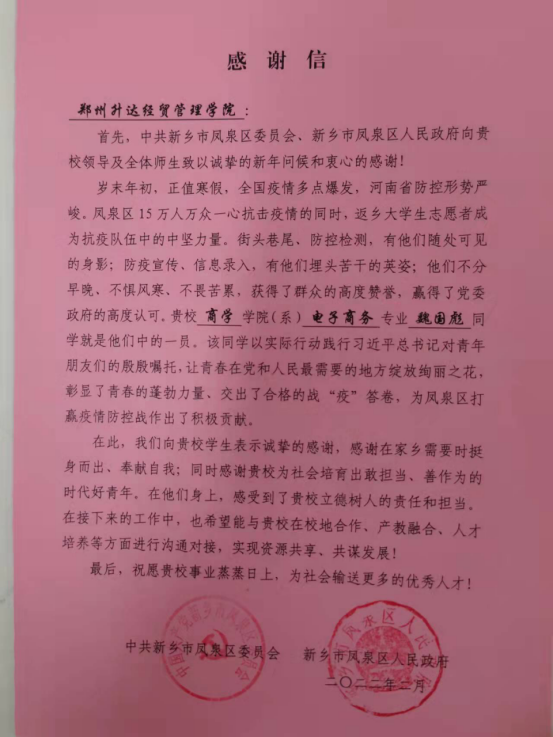 近日,yl7703永利集团官网收到一封来自新乡市凤泉区人民政府的感谢信。信中对2021级电子商务专升本2班的魏国彪同学,在疫情期间主动请缨,为疫情防控工作贡献力量,给予了高度评价,表示了诚挚感谢! 信中介绍:“从...[详细]