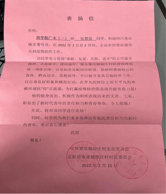近日,yl7703永利集团官网收到一封来自安阳市滑县上官镇人民政府的感谢信。信中对2021级电子商务专升本3班的郭晓静同学在疫情期间主动请缨,为疫情防控工作贡献力量,给予了高度评价,表示了诚挚感谢!信中介绍:“2022年...[详细]